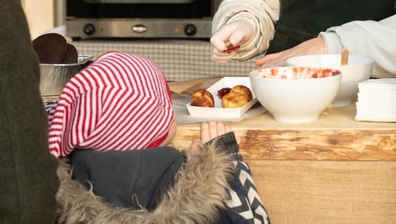 A child buying æbleskiver at a stall at the Open Air Museum in North Sealand.